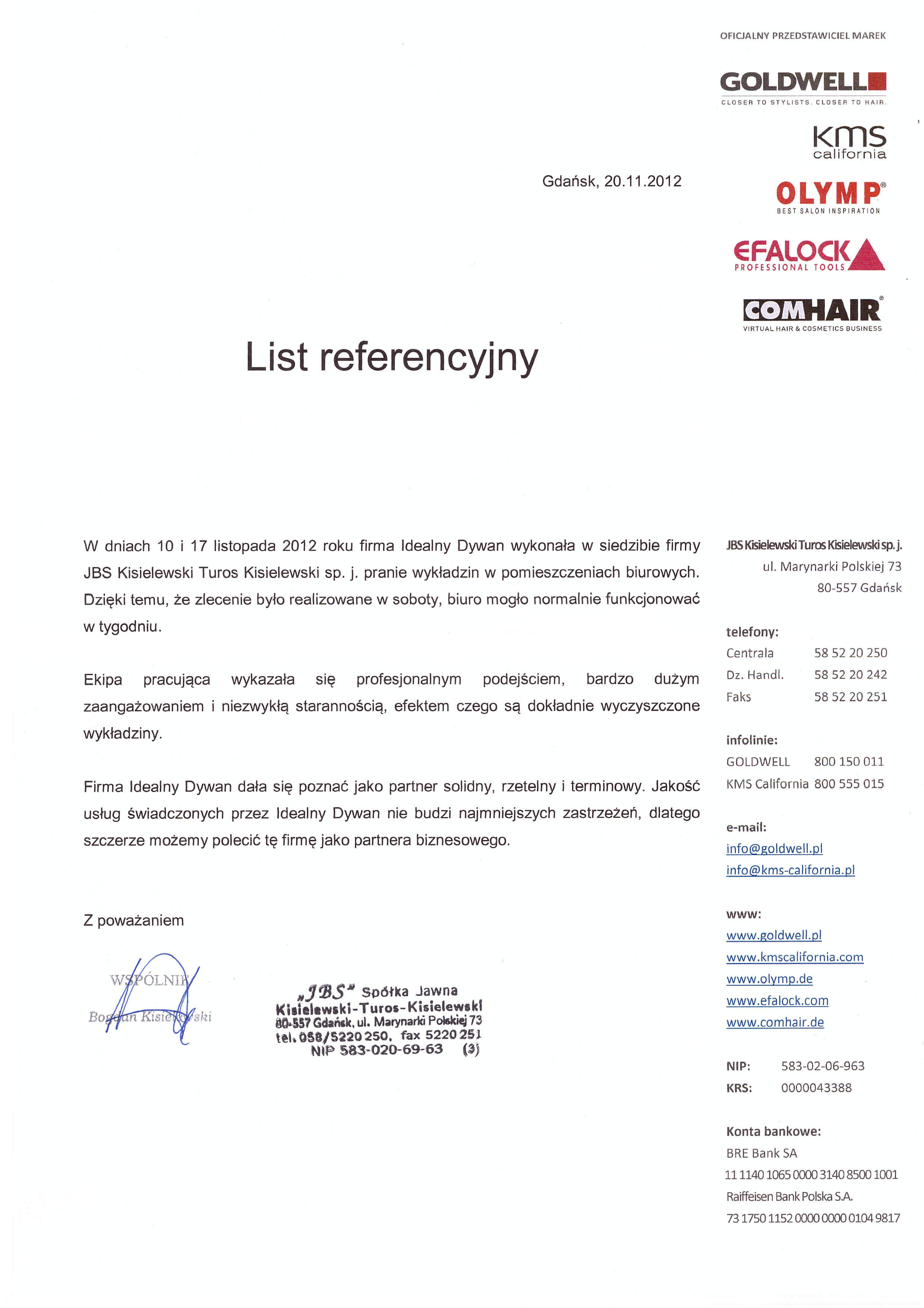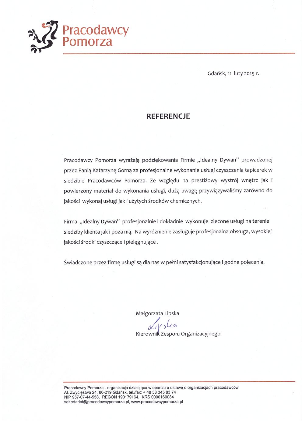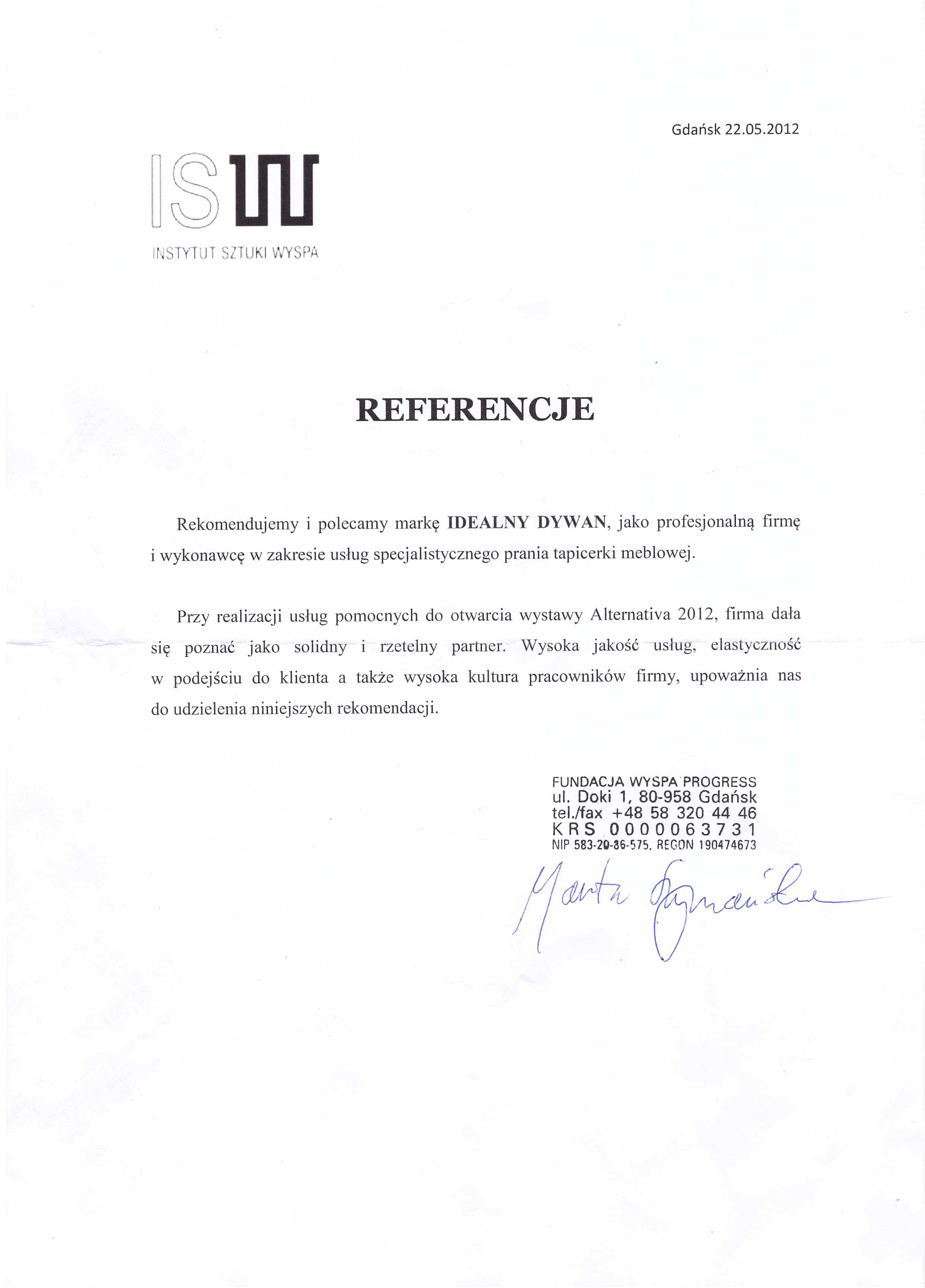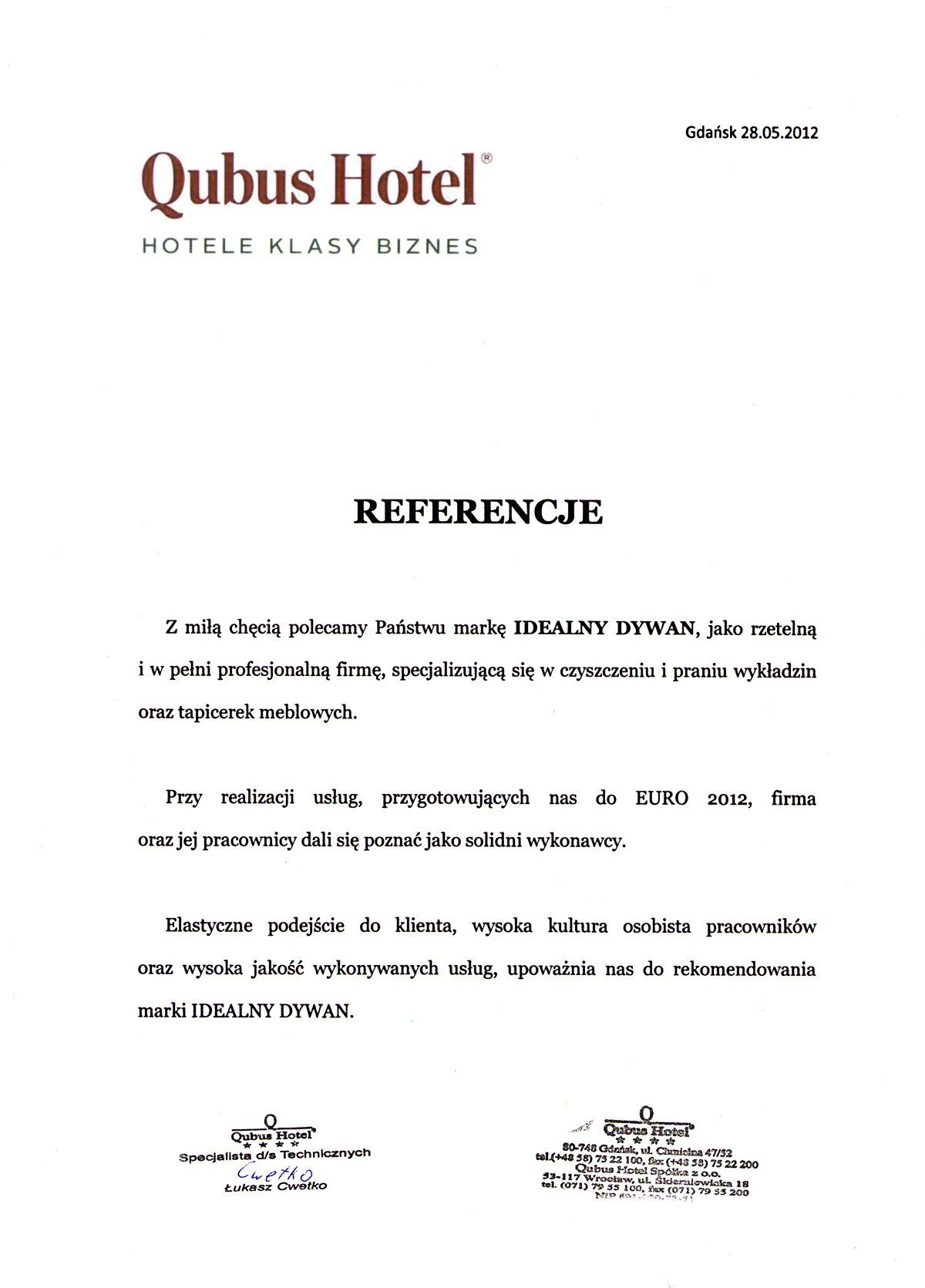 Przy realizacji usług przygotowujących nas do EURO 2012, firma oraz jej pracownicy dali się poznać jako solidni wykonawcy. Elastyczne podejście do klienta, wysoka kultura osobista pracowników oraz wysoka jakość wykonywanych usług, upoważnia nas do rekomendowania marki Idealny Dywan.